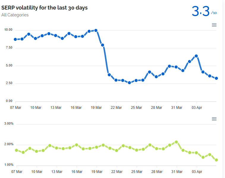- O começo de abril mostra crescimento generalizado, o que sugere que o Core Update de 27 de março ainda estava se estabilizando até os primeiros dias de abril.